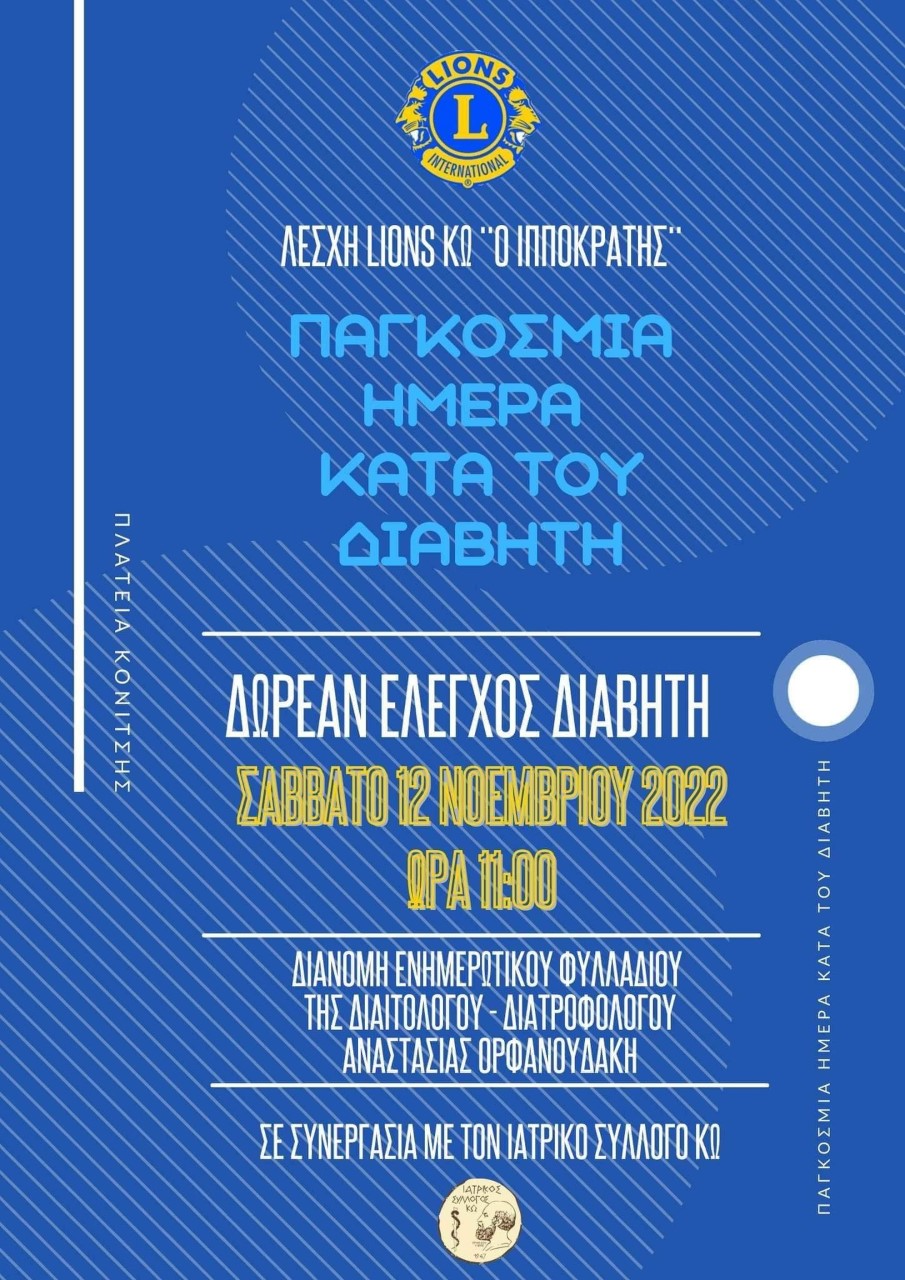 Η Λέσχη Lions Κω « Ο ΙΠΠΟΚΡΑΤΗΣ» εν όψει της Παγκόσμιας Ημέρας για τον Διαβήτη, σε συνεργασία με τον Ιατρικό Σύλλογο Κω θα πραγματοποιήσει μετρήσεις επιπέδου σακχάρου αίματος, το Σάββατο 12/11,στις 11:00 έως 13:00,στην πλ. Κονίτσης.