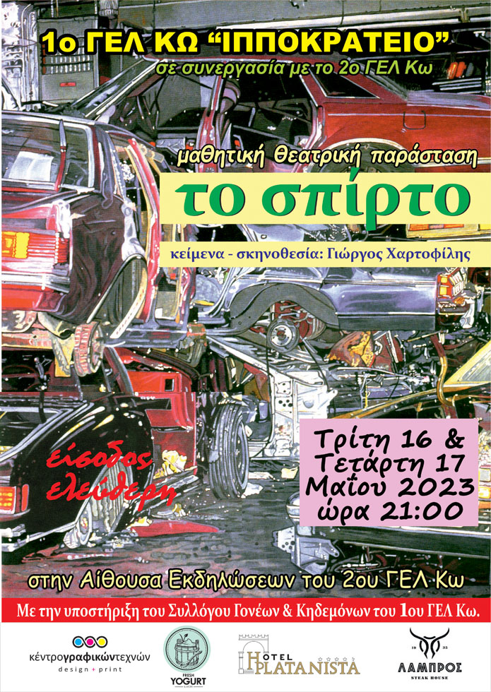 Τη μαθητική θεατρική παράσταση “το σπίρτο” διοργανώνει το 1ο ΓΕΛ Κω «ΙΠΠΟΚΡΑΤΕΙΟ» σε συνεργασία µε το 2ο ΓΕΛ Κω “Οδυσσέας Ελύτης”, στο πλαίσιο της παρουσίασης των Προγραμμάτων Σχολικών Δραστηριοτήτων για το τρέχον σχολικό έτος 2022-23, με συμμετοχή μαθητών και από τα δύο Λύκεια. Το έργο εντάσσεται στη γενικότερη προσπάθεια πρόληψης των τροχαίων ατυχημάτων στους εφήβους.   Η παράσταση θα πραγματοποιηθεί, με ελεύθερη είσοδο για το κοινό, την Τρίτη 16 και την Τετάρτη 17 Μαΐου 2023 και ώρα 9:00 μ.μ. στην Αίθουσα Εκδηλώσεων του 2ου ΓΕΛ Κω ενώ το πρωί της κάθε μέρας θα παρουσιαστεί στους μαθητές του 1ου και του 2ου Λυκείου.