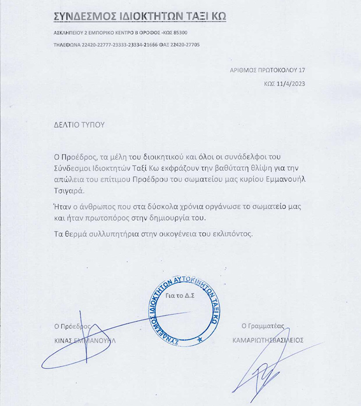 Στην θλίψη σκόρπισε την τοπική μας κοινωνία η είδηση του θανάτου του Εμμανουήλ Τσιγαρά (89 ετών) πρώην Προέδρου του Συλλόγου Μικρασιατών Κω.