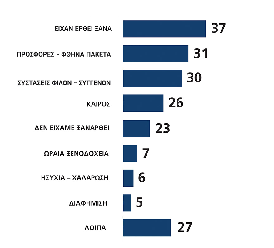 Ακολούθησαν, τα οικονομικά πακέτα διακοπών (31), οι συστάσεις φίλων - συγγενών (30), ο καιρός (26), το ότι δεν είχαν ξανάρθει στην Κω (23), τα ωραία ξενοδοχεία (7), η ησυχία – χαλάρωση (6) και η διαφήμιση (5).