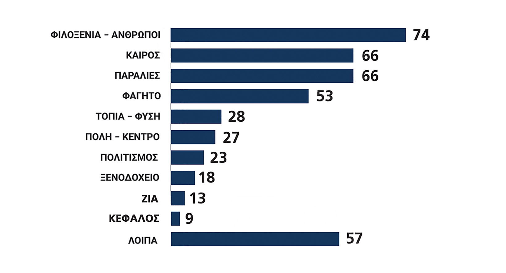 Στα θετικά, την κορυφή καταλαμβάνουν και φέτος η φιλοξενία και οι άνθρωποι του νησιού μας και ακολουθούν ο καιρός, οι παραλίες και το φαγητό.