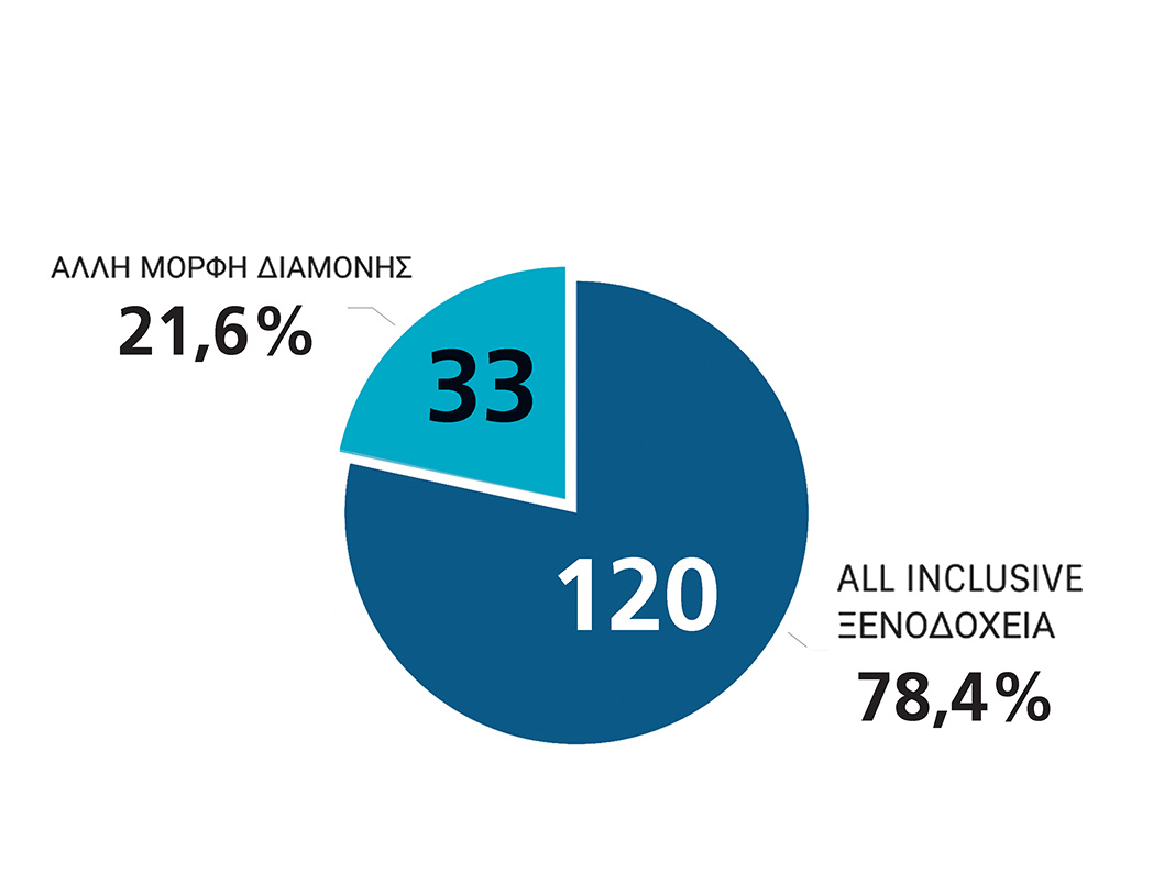 Το all inclusive συνεχίζει να αποτελεί την βασική μορφή διαμονής των επισκεπτών στο νησί μας. Σύμφωνα με τις απαντήσεις, το 78,4%% των ερωτηθέντων, επέλεξε διαμονή σε all inclusive ξενοδοχείο, ενώ μόλις το 21,6% επέλεξε κάποια άλλη μορφή διαμονής.
