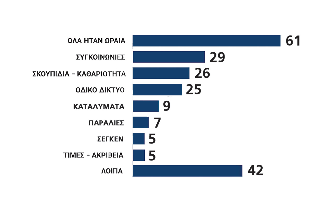 σκουπίδια – καθαριότητα (26), οδικό δίκτυο (25), καταλύματα (9), παραλίες (7), Σέγκεν (5), τιμές – ακρίβεια 5.