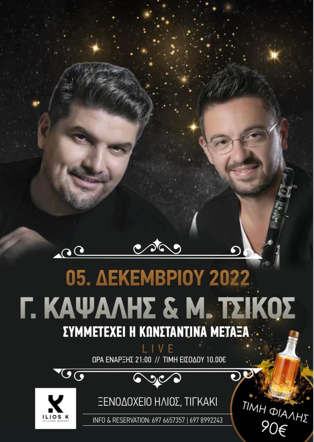 Mην χάσετε την Δευτέρα 5 Δεκεμβρίου 2022 στο Ξενοδοχείο ΗΛΙΟΣ "Ilios K. Village Resort" στο Τιγκακι, μία υπέροχη μουσική βραδιά, γεμάτη γλέντι και χορό, με τους Γιάννη Καψάλη & Μάκη Τσίκο.