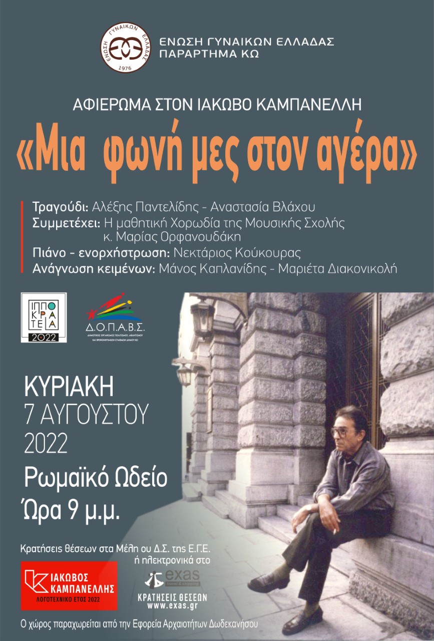 Η Ένωση Γυναικών Ελλάδος (Ε.Γ.Ε.) –Παράρτημα Κω με την στήριξη του ΔΟΠΑΒΣ και της Εφορείας Αρχαιοτήτων Δωδεκανήσου στα πλαίσια των Θερινών Ιπποκρατείων 2022 διοργανώνει Μουσική Παράσταση αφιερωμένη στον Ιάκωβο Καμπανέλλη με τίτλο «Μια φωνή μες στον αγέρα» την Κυριακή 07 Αυγούστου στις 21:00 στο Ρωμαϊκό Ωδείο.