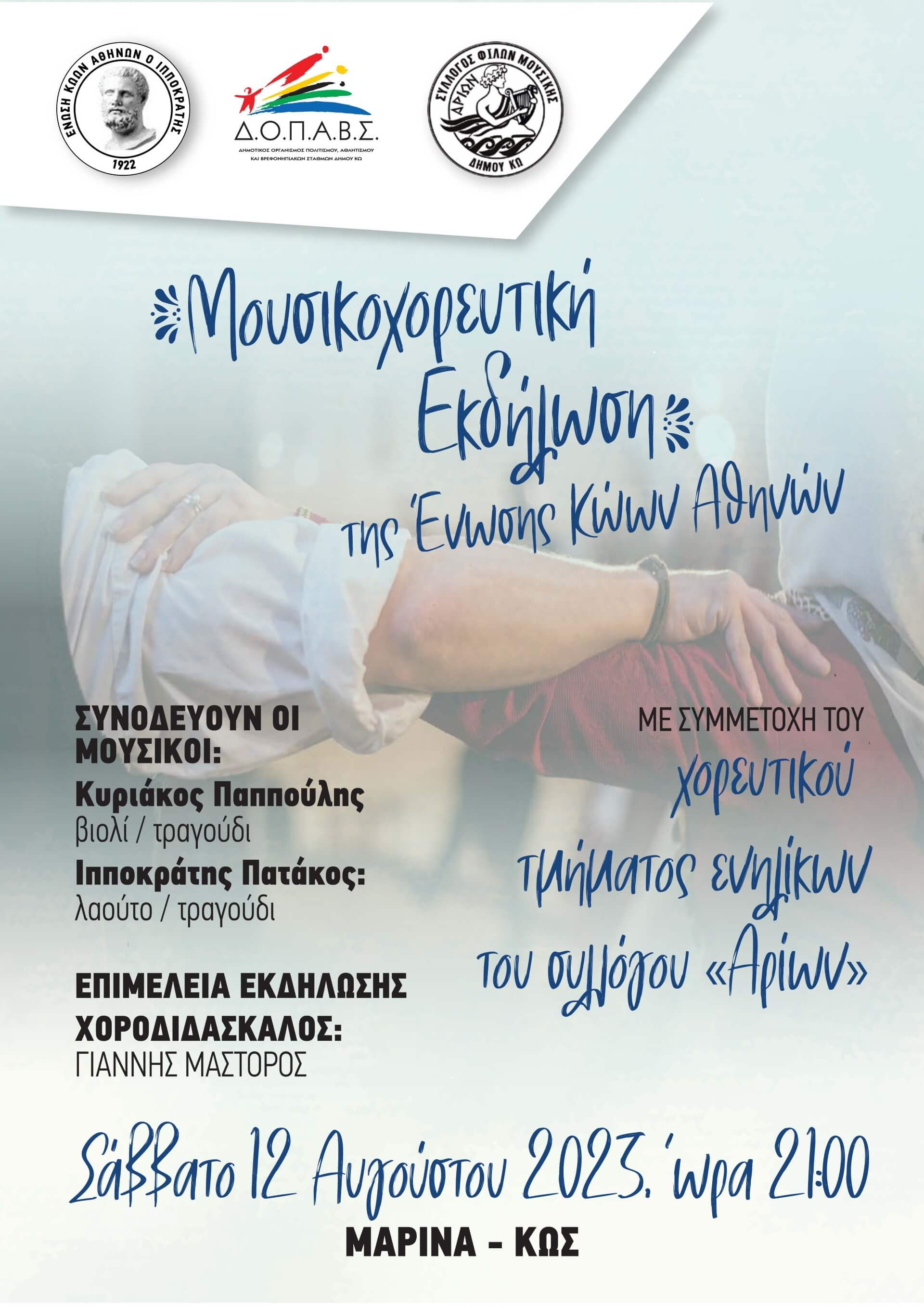 Η Ένωση Κώων Αθηνών σας προσκαλεί στη μουσικοχορευτική εκδήλωση που θα πραγματοποιηθεί το Σάββατο 12/8/2023 στις 21:00 στη Μαρίνα Κω.