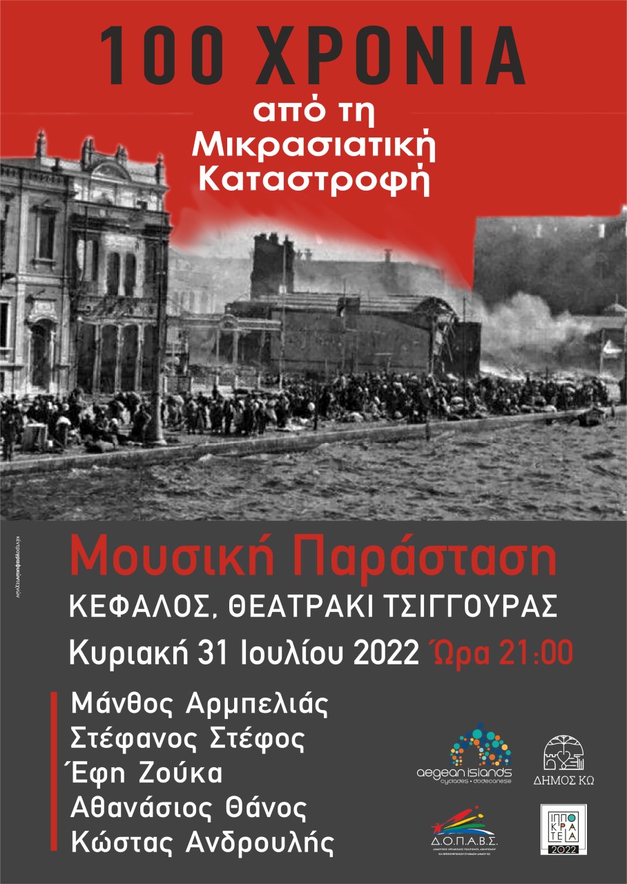 Η Περιφέρεια Νοτίου Αιγαίου με την στήριξη του ΔΟΠΑΒΣ στα πλαίσια των Θερινών Ιπποκρατείων 2022 παρουσιάζει Μουσικοθεατρική παράσταση αφιερωμένη στην Επέτειο των 100 χρόνων από την Μικρασιατική Καταστροφή την Κυριακή 31 Ιουλίου και ώρα 21:00 στο Θεατράκι της Τσιγγούρας στη Κέφαλο.
