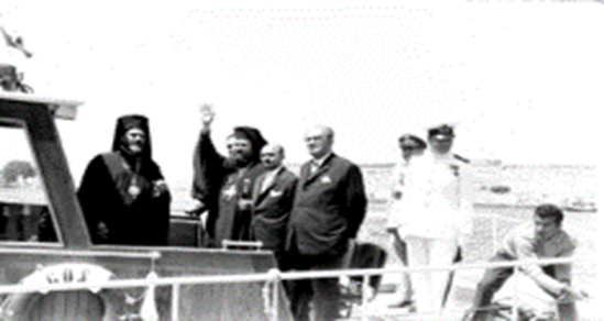 Στο σκάφος του Λιμενικού υποδέχονται τους Ιεράρχες ο έπαρχος Νίκος Μπούρας και ο Λιμενάρχης.