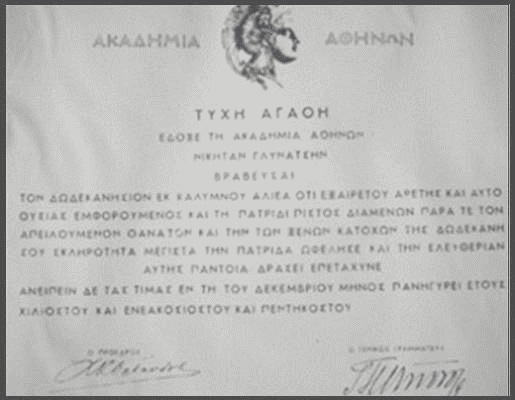 Μετά  γνώμιν της Γ’ τάξεως και απόφασιν της ολομέλειας απονέμεται:Βραβείον  Πατριωτισμού και αυτοθυσίας εις τον Καλύμνιον ανάπηρον αλιέα Νικήταν Γλυνάτσην, διότι ούτος προθύμως ανέλαβε και επιτυχώς, αλλ’ άνευ ουδεμίας αμοιβής, εξετέλεσε καθ’ όλην την διάρκεια του τελευταίου παγκοσμίου πολέμου, μέχρι της υπό των συμμάχων καταλήψεως της  Δωδεκανήσου μετά προφανούς κινδύνου της ζωής του, το σπουδαίον αλλά και δυσχερέστατον έργον της συλλογής στρατιωτικών πληροφοριών περί της κινήσεως των εχθρικών πολεμικών και μεταγωγικών πλοίων και στρατευμάτων, ιδία εν Λέρω, τας οποίας και μετέδιδεν εις τας εν Μικρασιατική ακτή συμμαχικάς υπηρεσίας, μεταβαίνων εκεί τακτικώς κατά τη νύκτα διά της μικράς του λέμβου Χαρακτηριστικό του φτωχού, αλλά ηρωικού τούτου αλιέως είναι το λεγόμενον υπ’ αυτού μετ’ απροσποιήτου μετριοφροσύνης ότι « Αυτό θα το έπρατε και πας άλλος». Βραβεύουσα η Ακαδημία  τον μονόχειρα και μονόφθαλμον  τούτον αλιέα δια τον πατριωτισμόν του και την αυτοθυσίαν του, τιμά εν τω προσώπω  αυτού και πάντας τους αγνώστους ήρωας της Δωδεκανήσου οι οποίοι συνήργησαν εις την απελευθέρωσιν της πατρίδος των από της μακραίωνος δουλείας.