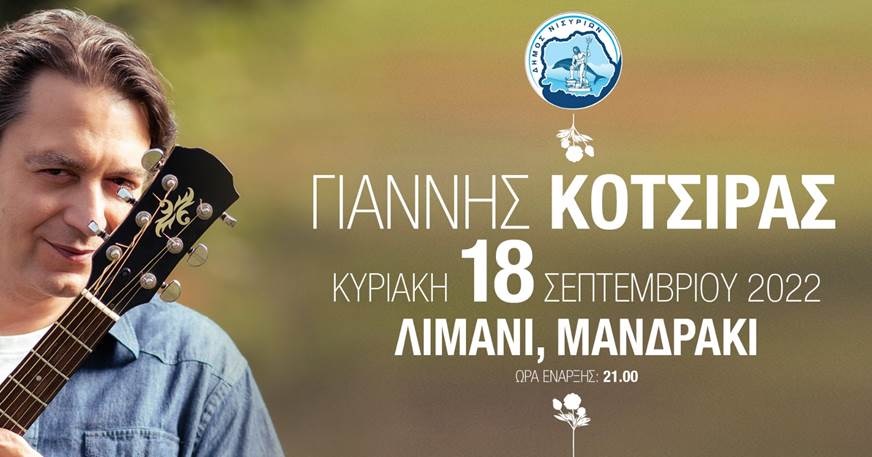 Την Κυριακή 18 Σεπτεμβρίου και ώρα 21:00, στο λιμάνι του Μανδρακίου, κλείνοντας τη θερινή περίοδο για το 2022, θα έχουμε τη χαρά να απολαύσουμε το δημοφιλή τραγουδιστή Γιάννη Κότσιρα. Ο ερωτικός ερμηνευτής της νεότερης γενιάς, με την εκφραστική του φωνή θα μας παρουσιάσει παλιά και καινούρια τραγούδια, που έχουμε όλοι σιγοτραγουδήσει, εμπνευσμένες διασκευές και επιλογές σε λαϊκά τραγούδια.