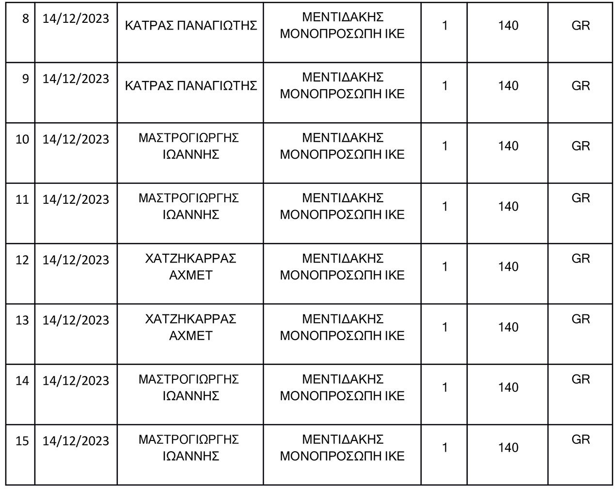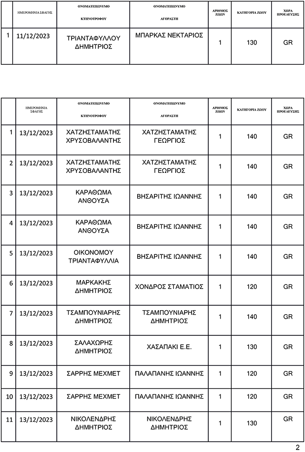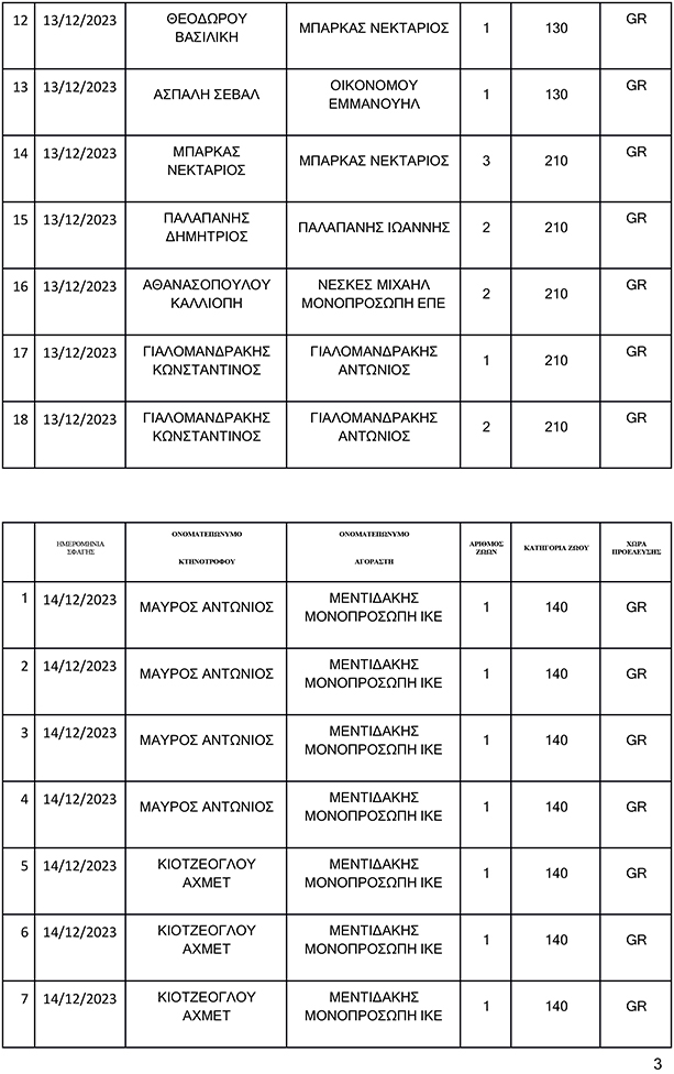 Σας αποστέλλουμε πίνακα όπου απεικονίζονται αναλυτικά οι σφαγές, οι οποίες έλαβαν χώρα στο Δημοτικό Σφαγείο Κω την Δευτέρα 11, την Τετάρτη 13 και την Πέμπτη 14/12/2023 .