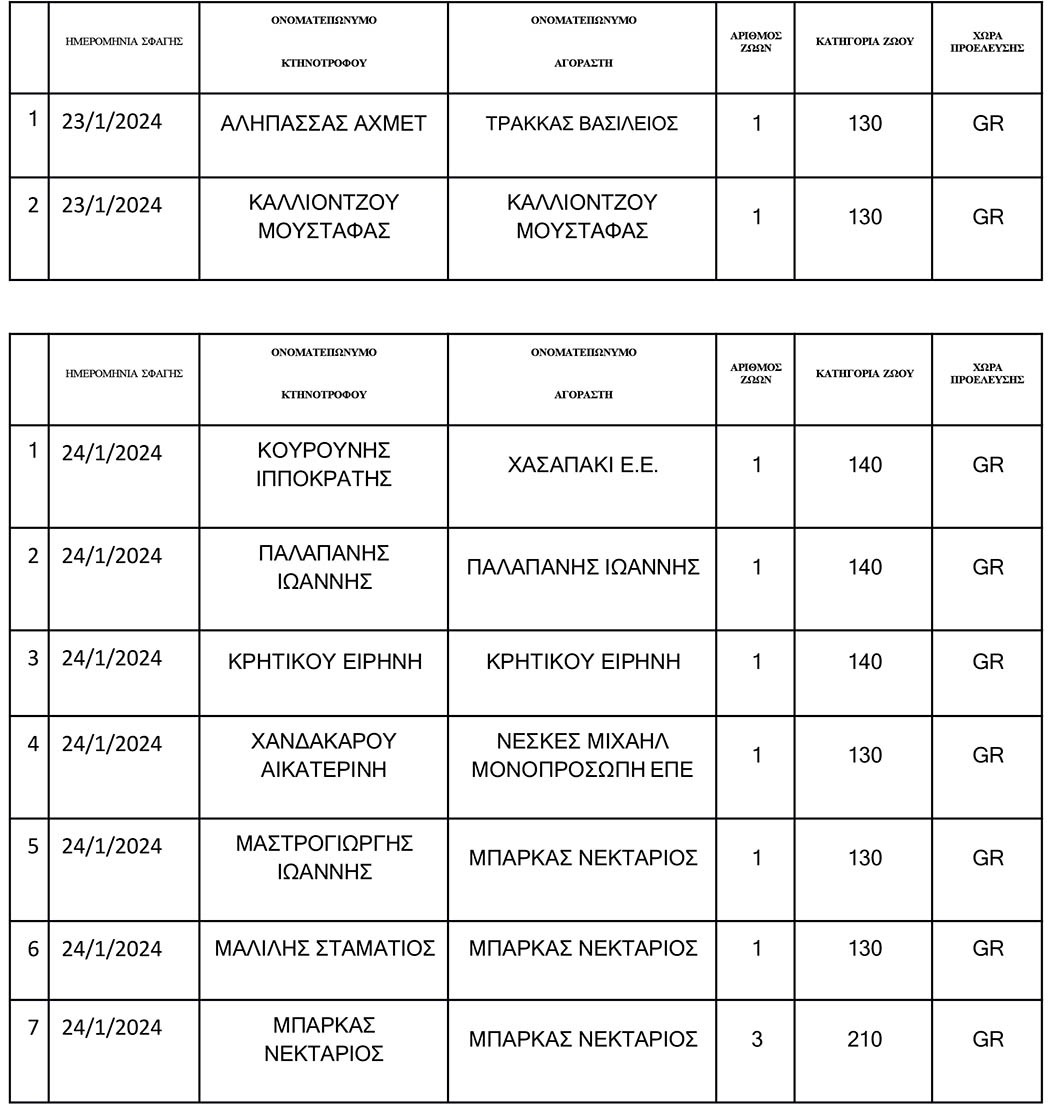 Σας αποστέλλουμε πίνακα όπου απεικονίζονται αναλυτικά οι σφαγές οι οποίες έλαβαν χώρα στο Δημοτικό Σφαγείο Κω την Τρίτη 23/1/2024 και την Τετάρτη 24/1/2024.