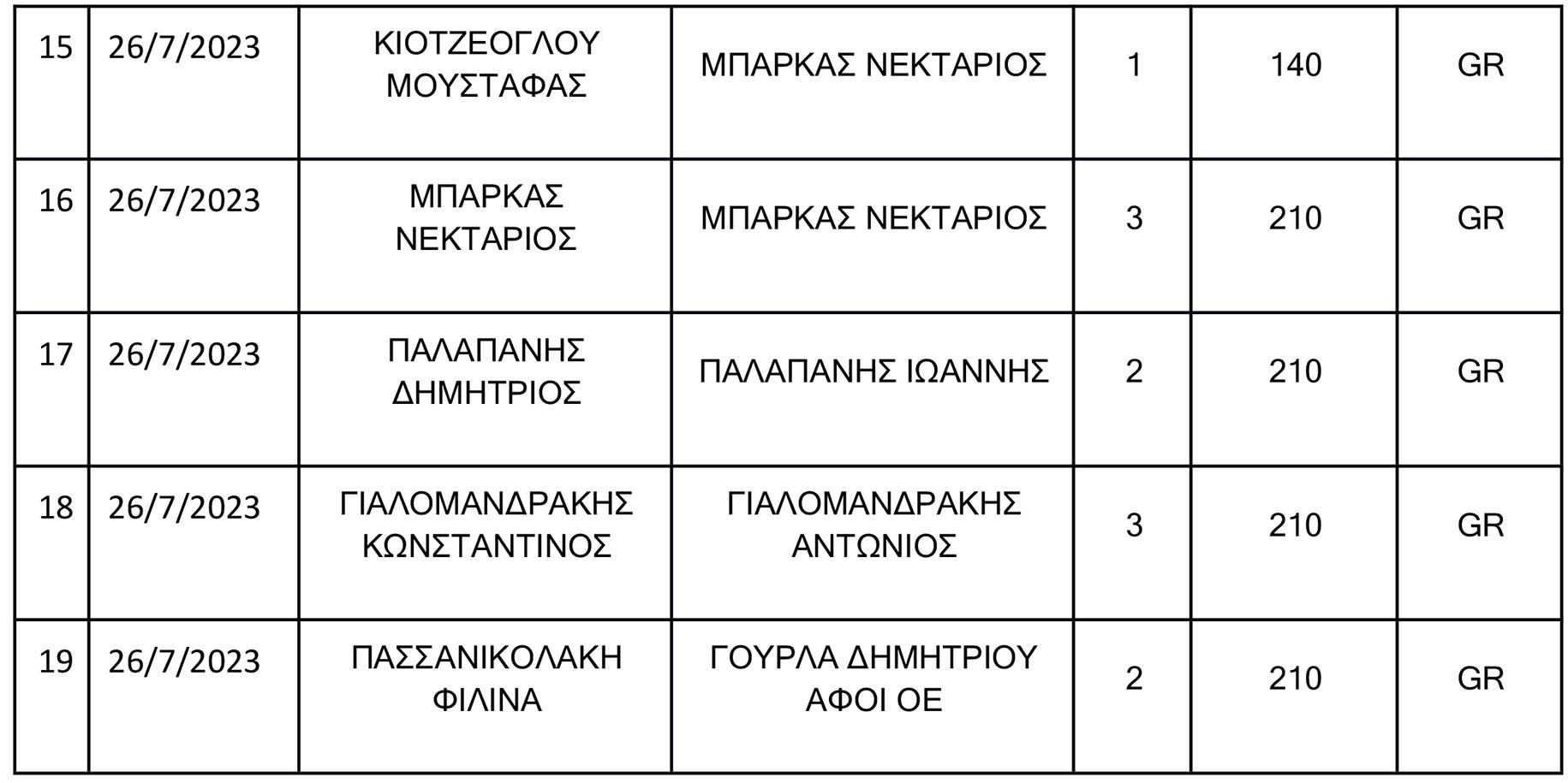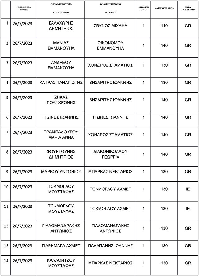 Σας αποστέλλουμε πίνακα όπου απεικονίζονται αναλυτικά οι σφαγές οι οποίες έλαβαν χώρα στο Δημοτικό Σφαγείο Κω την Τετάρτη 26/7/2023 .
