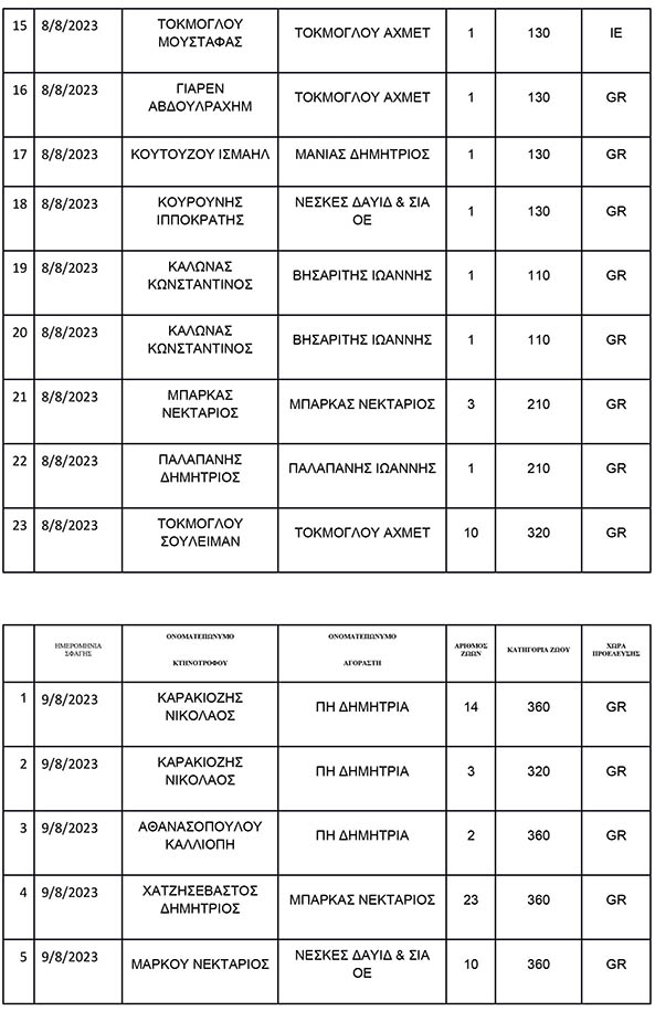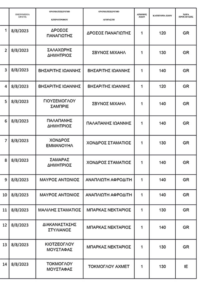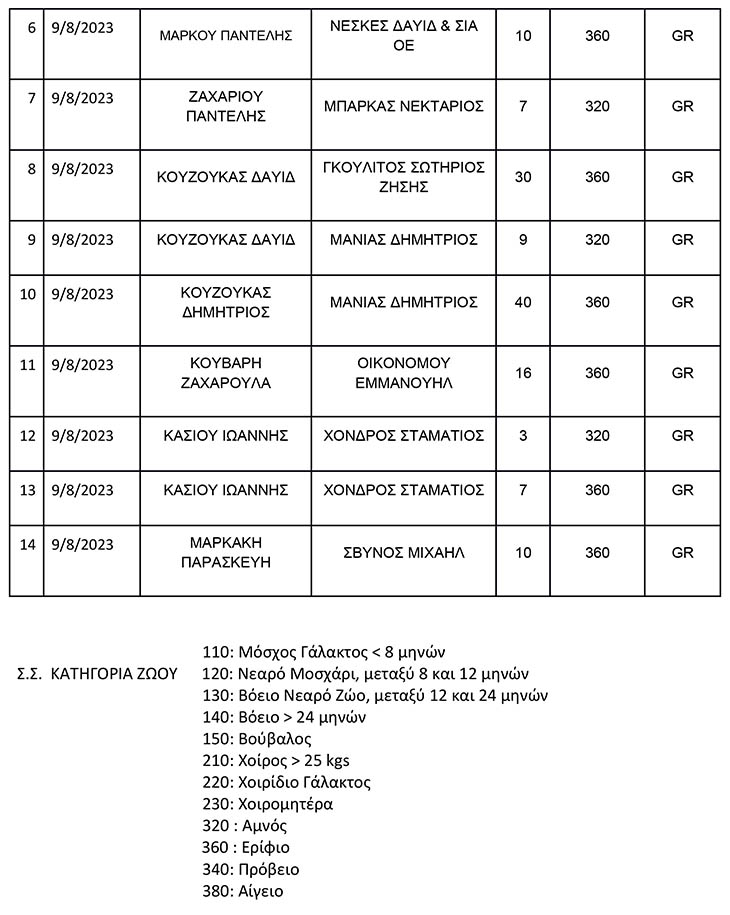 Σας αποστέλλουμε πίνακα όπου απεικονίζονται αναλυτικά οι σφαγές οι οποίες έλαβαν χώρα στο Δημοτικό Σφαγείο Κω την Τρίτη 8/8 και την Τετάρτη 9/8.
