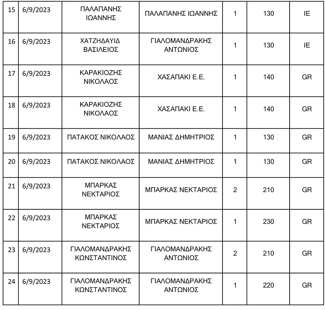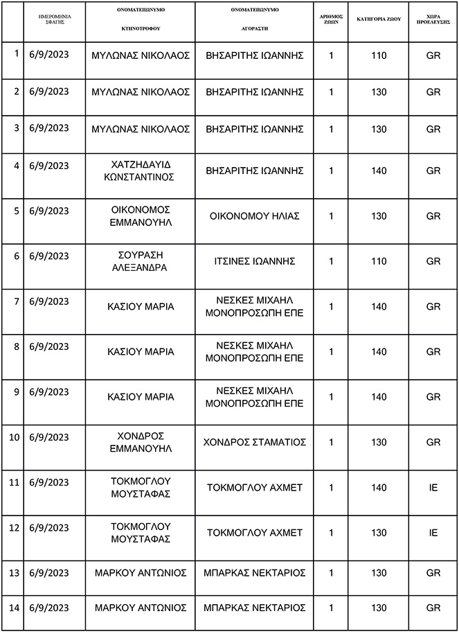 Σε συνέχεια του ανωτέρω σχετικού εγγράφου, σας αποστέλλουμε πίνακα όπου απεικονίζονται αναλυτικά οι σφαγές οι οποίες έλαβαν χώρα στο Δημοτικό Σφαγείο Κω την Τετάρτη 6/9/2023 .