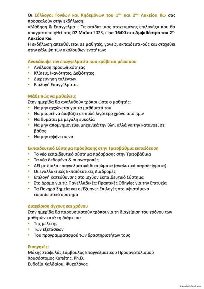 Ο Σύλλογος Γονέων και Κηδεμόνων του 2ου ΓΕΛ ΚΩ σε συνεργασία με το Σύλλογο Γονέων και Κηδεμόνων του 1ου ΓΕΛ ΚΩ προσκαλούν μαθητές και γονείς να παρακολουθήσουν ομιλία με τίτλο