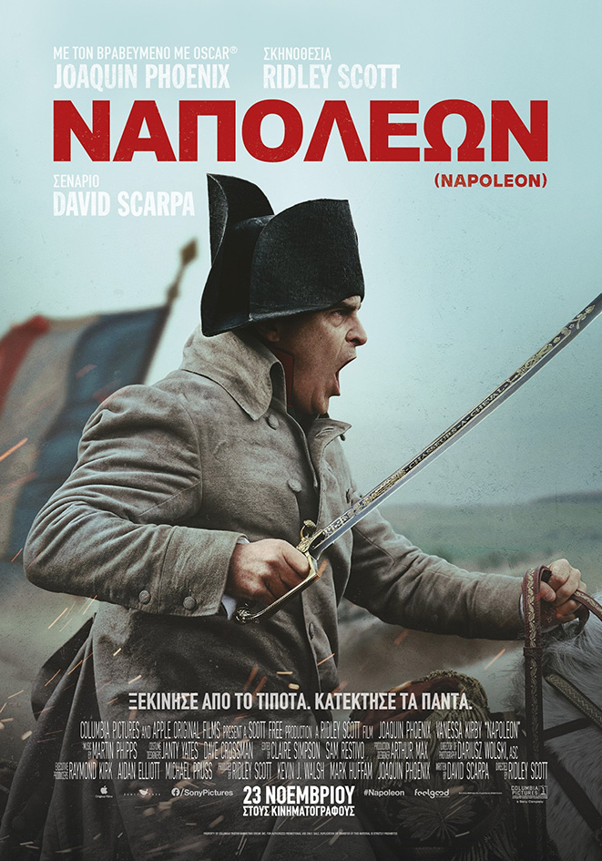 Υπόθεση: Η ταινία ΝΑΠΟΛΕΩΝ είναι μια θεαματική, επική περιπέτεια για την πολυτάραχη άνοδο και πτώση του εμβληματικού Γάλλου Αυτοκράτορα Ναπολέοντα Βοναπάρτη, τον οποίο υποδύεται ο βραβευμένος με Όσκαρ Joaquin Phoenix. Η ταινία, μια πολύ υψηλών προδιαγραφών παραγωγή με την υπογραφή του θρυλικού σκηνοθέτη Ridley Scott, αποτυπώνει το ανελέητο ταξίδι του Βοναπάρτη στην εξουσία υπό το πρίσμα της εμμονικής, εκρηκτικής σχέσης του με τη μόνη αληθινή του αγάπη, την Ιωσηφίνα, προβάλλοντας τις οραματικές στρατιωτικές και πολιτικές τακτικές του μέσα από μερικές από τις πιο απαιτητικές δυναμικές σκηνές μάχης στην ιστορία του κινηματογράφου