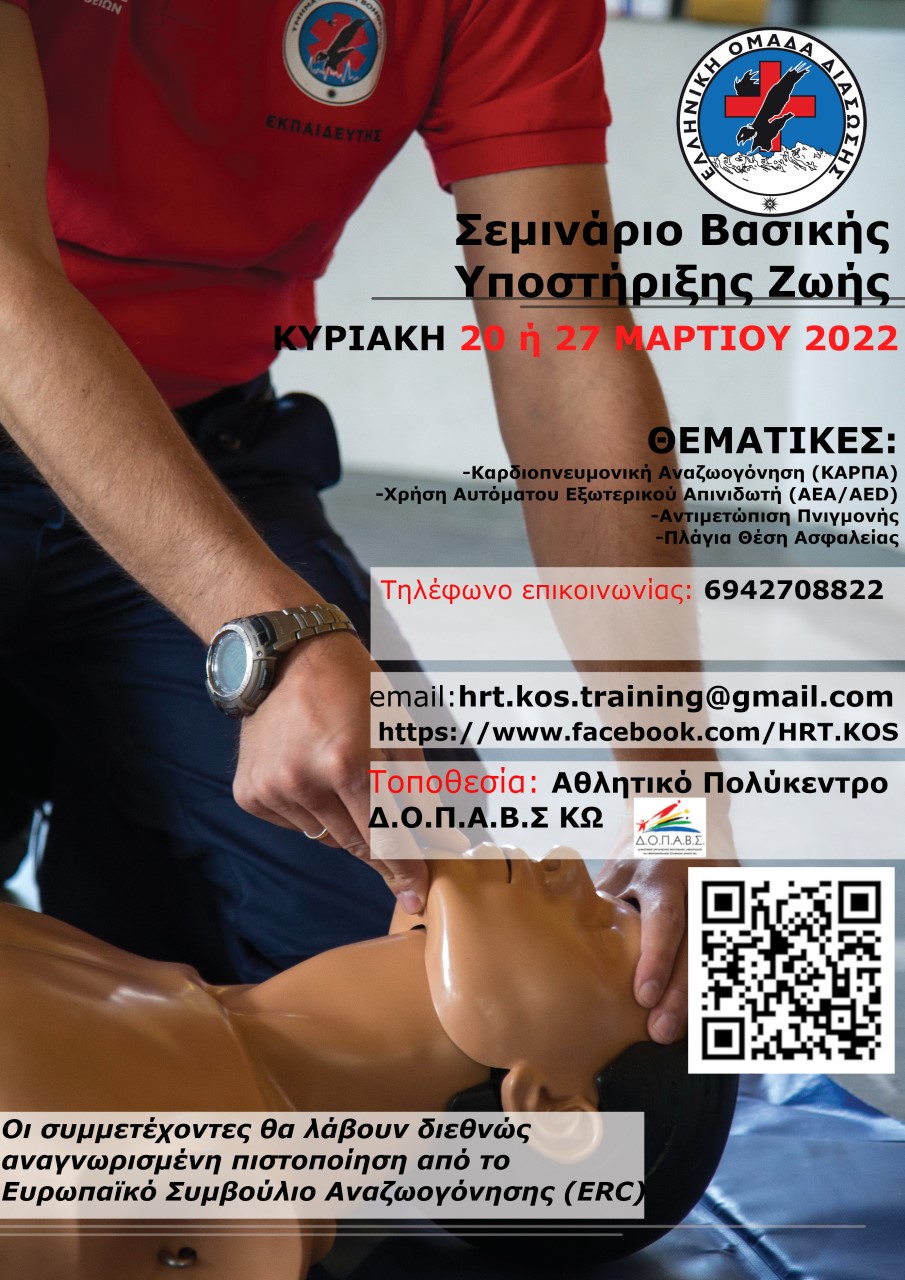 Η Ελληνική Ομάδα Διάσωσης Κω διοργανώνει πιστοποιημένα σεμινάρια πρώτων βασικής υποστήριξης ζωής τις Κυριακές 20 και 27 Μαρτίου 2022, στο Αθλητικό Πολύκεντρο (στο νέο στάδιο Ανταγόρας).