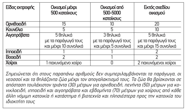 1. Ο μέγιστος αριθμός οικόσιτων ζώων ή πτηνών κατ’ειδος που μπορεί να διατηρεί κάθε οικογένεια για παραγωγή αποκλειστικά και μόνο κτηνοτροφικών προϊόντων που καλύπτουν τις ανάγκες της οικογένειας, ορίζεται στον πίνακα