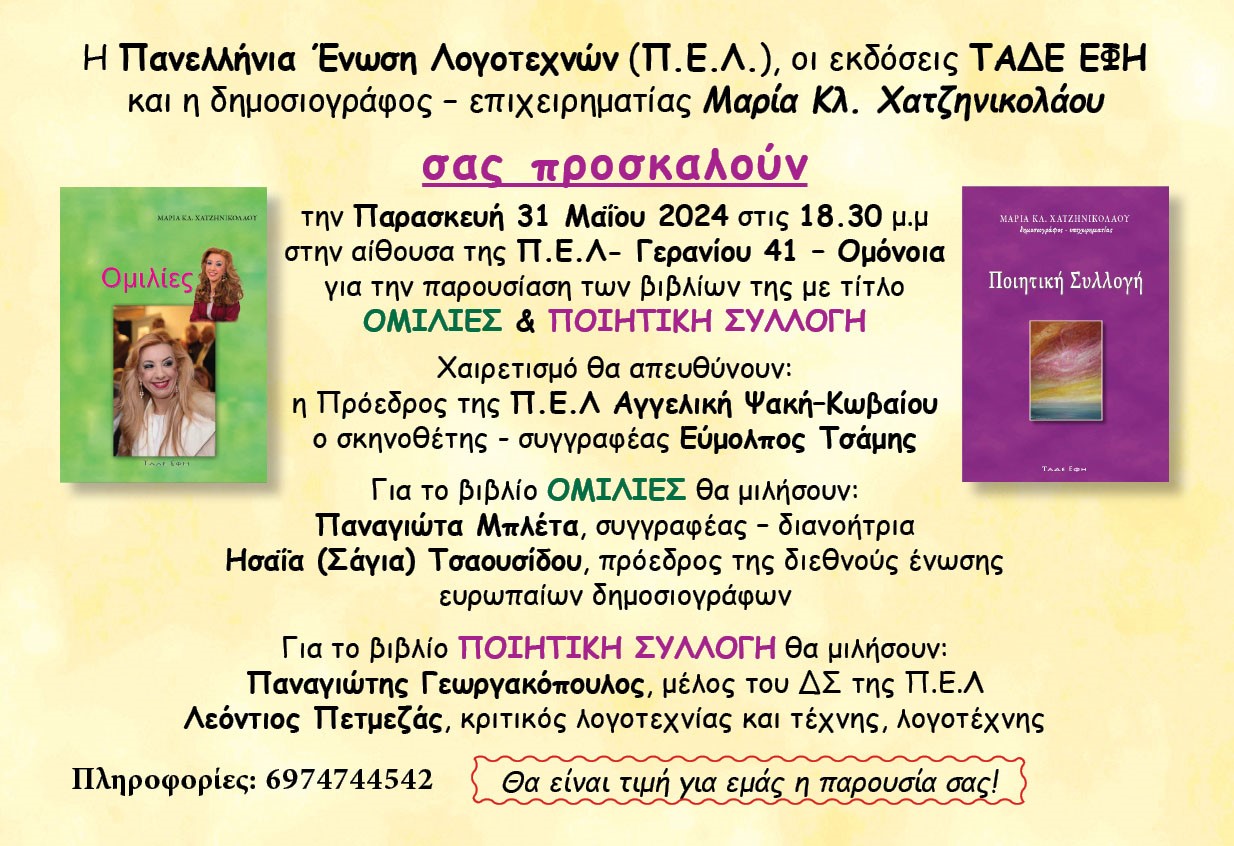 Η Πανελλήνια Ένωση Λογοτεχνών (Π.Ε.Λ), οι εκδόσεις ΤΑΔΕ ΕΦΗ και η δημοσιογράφος - επιχειρηματίας Μαρία Κλ. Χατζηνικολάου σας προσκαλούν την Παρασκευή 31 Μαίου 2024 στις 18.30 μ.μ. στην αίθουσα της Π.Ε.Λ - Γερανίου 41 - Ομόνοια για την παρουσίαση των βιβλίων της με τίτλο