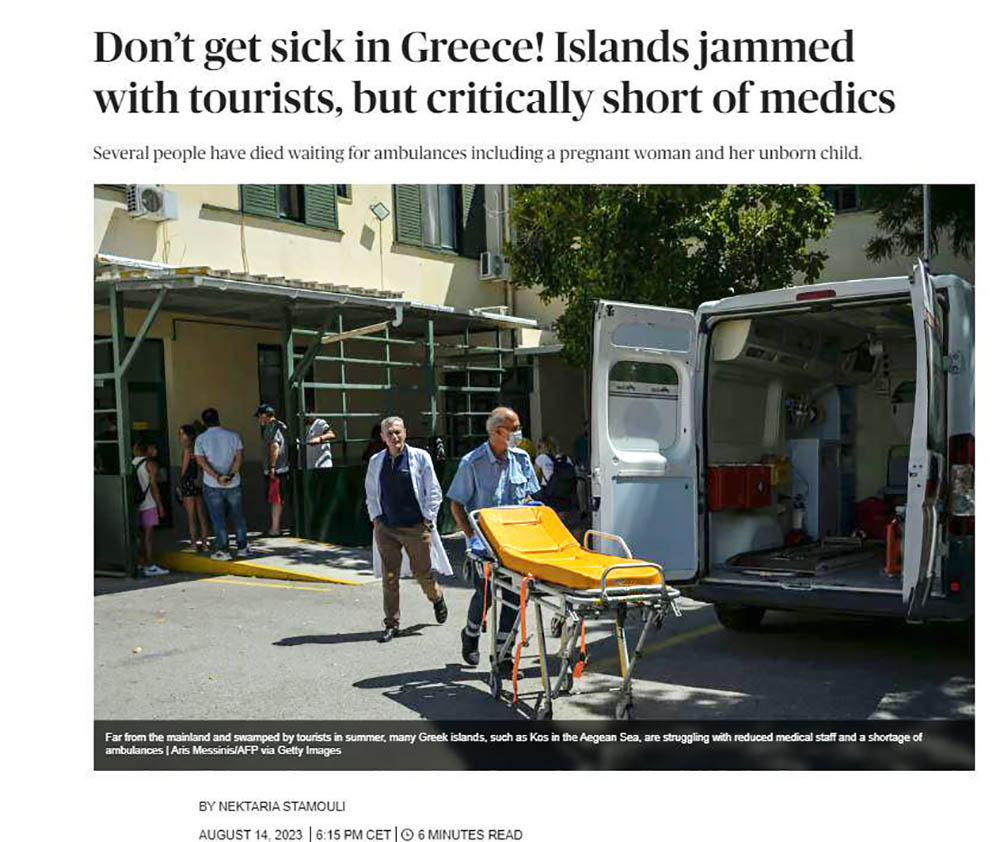 Χαρακτηριστικός είναι ο τίτλος του δημοσιεύματος: «Μην αρρωστήσετε στην Ελλάδα! Τα νησιά είναι γεμάτα τουρίστες, αλλά με δραματικές ελλείψεις γιατρών». «Τα ειδυλλιακά νησιά της Ελλάδας ξεχειλίζουν από τουρίστες, αλλά το σύστημα υγείας τους έχει ρωγμές», επισημαίνει το Politico.