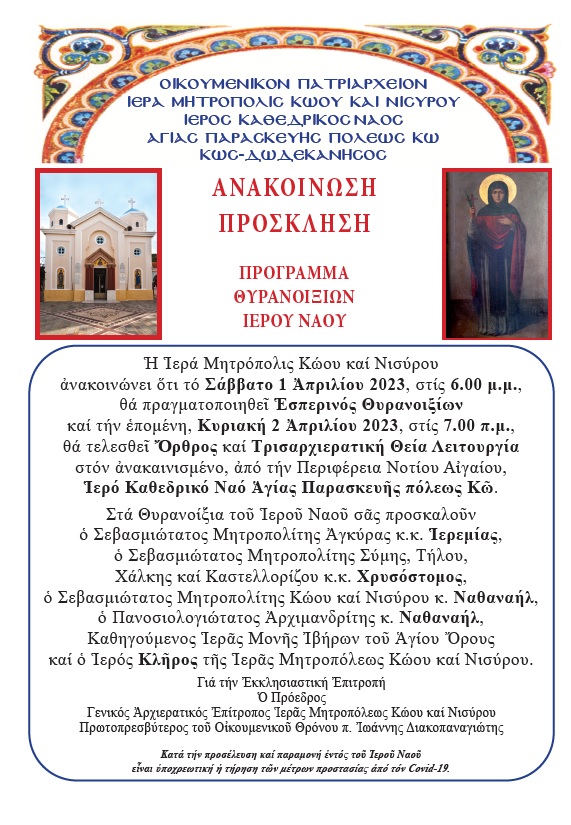 Ἡ Ἱερά Μητρόπολις Κώου καί Νισύρου ἀνακοινώνει ὅτι τό Σάββατο 1 Ἀπριλίου 2023, στίς 6.00 μ.μ., θά πραγματοποιηθεῖ Ἑσπερινός Θυρανοιξίων καί τήν ἑπομένη, Κυριακή 2 Ἀπριλίου 2023, στίς 7.00 π.μ., θά τελεσθεῖ Ὄρθρος καί Τρισαρχιερατική Θεία Λειτουργία