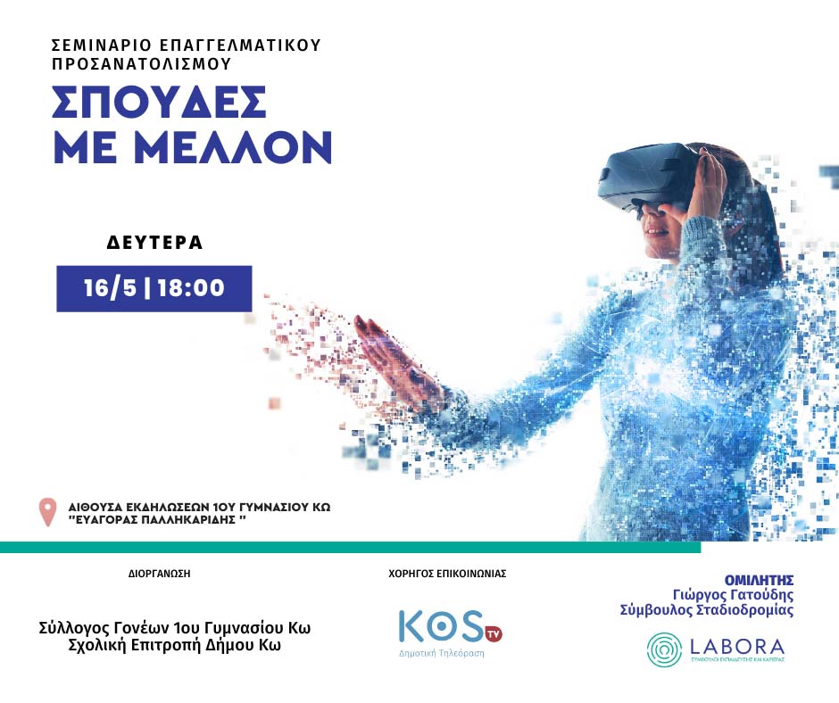 Ο Σύλλογος Γονέων 1ου Γυμνασίου Κω και η Σχολική Επιτροπή Δήμου Κω στα πλαίσια της έγκαιρης και έγκυρης ενημέρωσης των μαθητών και των γονέων διοργανώνει σεμινάριο επαγγελματικού προσανατολισμού με τίτλο: ΣΠΟΥΔΕΣ ΜΕ ΜΕΛΛΟΝ σε συνεργασία με την επιστημονική ομάδα της LABORA Σύμβουλοι Εκπαίδευσης (www.labora.gr)και ομιλητή τον Γιώργο Γατούδη, Σύμβουλο Εκπαίδευσης και Καριέρας και Υπεύθυνο Εκπαιδευτικών Προγραμμάτων της LABORA.