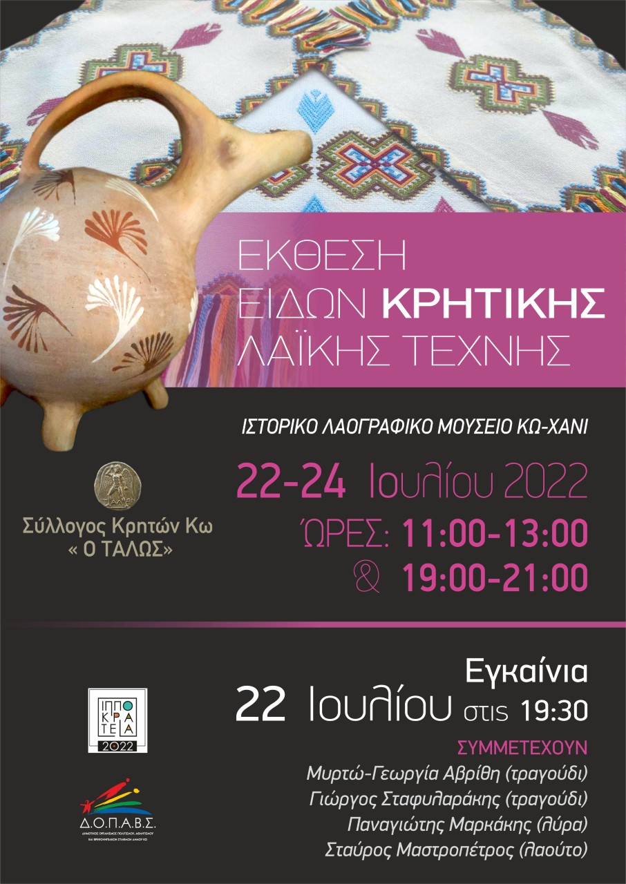 Ο Σύλλογος Κρητών Κω «Ο Τάλως» με την στήριξη του ΔΟΠΑΒΣ στα πλαίσια των Θερινών Ιπποκρατείων 2022 διοργανώνει Έκθεση Ειδών Κρητικής Λαϊκής Τέχνης από την Παρασκευή 22Ιουλίου έως την Κυριακή 24 Ιουλίου στο Ιστορικό Λαογραφικό Μουσείου –Χάνι