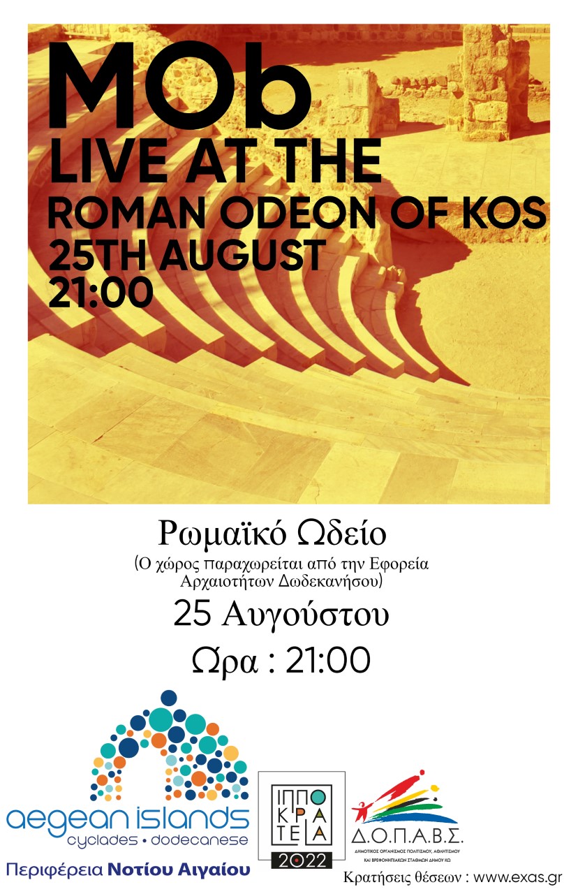 Η Περιφέρεια Νοτίου Αιγαίου με την στήριξη του ο ΔΟΠΑΒΣ στα πλαίσια των Θερινών Ιπποκρατείων 2022 διοργανώνουν συναυλία με το συγκρότημα “MOb” την Πέμπτη 25 Αυγούστου  ώρα 21:00 στο Ρωμαϊκό Ωδείο.