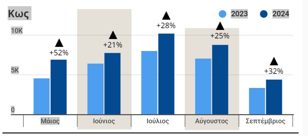 Η Κως καταγράφει μεγάλη άνοδο, με αύξηση στις κλεισμένες διανυκτερεύσεις κατά 52% τον Μάιο, 21% τον Ιούνιο, 28% τον Ιούλιο, 25% τον Αύγουστο και 32% το Σεπτέμβριο.