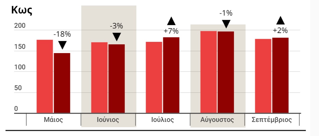 Στην Κρήτη, η αύξηση φτάνει το 37% για τους μήνες Μάιο και Ιούνιο, το 9% για τον Ιούλιο και τον Αύγουστο και στο 18% για το Σεπτέμβριο.