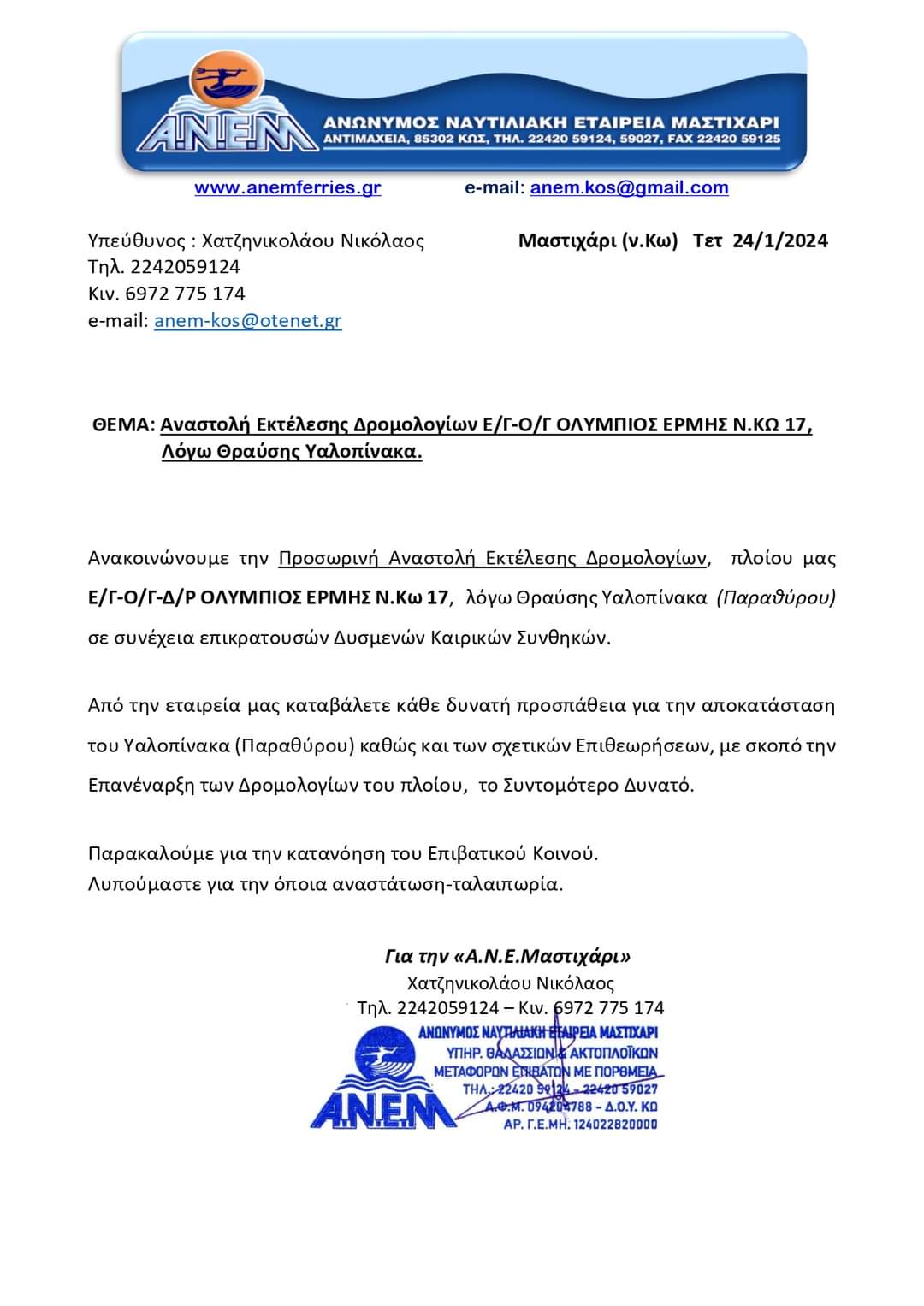Σταματούν (προσωρινά) τα δρομολόγια του νέου πλοίου "Ολύμπιος Ερμής" - Έσπασε παράθυρο του πλοίου