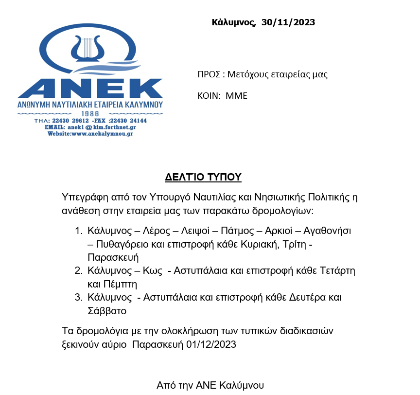 Με δύο(2) συμβάσεις που υπογράφηκαν σήμερα Πέμπτη 30 Νοεμβρίου 2023, ανατέθηκε στην ΑΝΕ Καλύμνου η εξυπηρέτηση με το πλοίο “Ν.ΚΑΛΥΜΝΟΣ” των παρακάτω δρομολογιακών γραμμών, για το χρονικό διάστημα, μέχρι την ολοκλήρωση του ανοικτού δημόσιου διεθνούς αρχικού μειοδοτικού διαγωνισμού που έχει προκηρυχθεί για τις 27-12-2023.