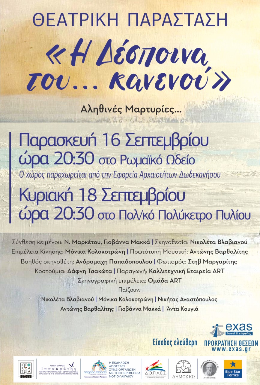 Η Αστική εταιρεία Κω «Ιπποκράτης», ο Σύλλογος Μικρασιατών Κω «Ο Ηρόδοτος», η Περιφέρεια Νοτίου Αιγαίου και ο ΔΟΠΑΒΣ με την στήριξη της Εφορείας Αρχαιοτήτων Δωδεκανήσου, στα πλαίσια των Θερινών Ιπποκρατείων 2022 παρουσιάζουν την Θεατρική παράσταση με τίτλο « Η Δέσποινα του κανενού» την Παρασκευή 16 Σεπτέμβριου και ώρα 20:30 στο Ρωμαϊκό Ωδείο & την Κυριακή 18 Σεπτεμβρίου και ώρα 20:30 στο Πολιτιστικό Πολύκεντρο Πυλίου.
