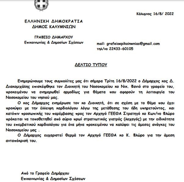 Αξιωματικός (ΥΙ) Στρατιωτικός ιατρός (βαθμός λοχαγού) ειδικότητας Καρδιολόγου , με απόφαση του Αρχηγού ΓΕΕΘΑ Κωνσταντίνου Φλώρου διατίθεται  για ένα μήνα στο Νοσοκομείο Καλύμνου για την κάλυψη επιτακτικών αναγκών του . Η διάθεση του στο Νοσοκομείο Καλύμνου,  ξεκινά από αύριο Τετάρτη 17 Αυγούστου  2022 και για 30 ημέρες. Ο εν λόγω ιατρός υπηρετεί σε στρατιωτική μονάδα της Ρόδου.