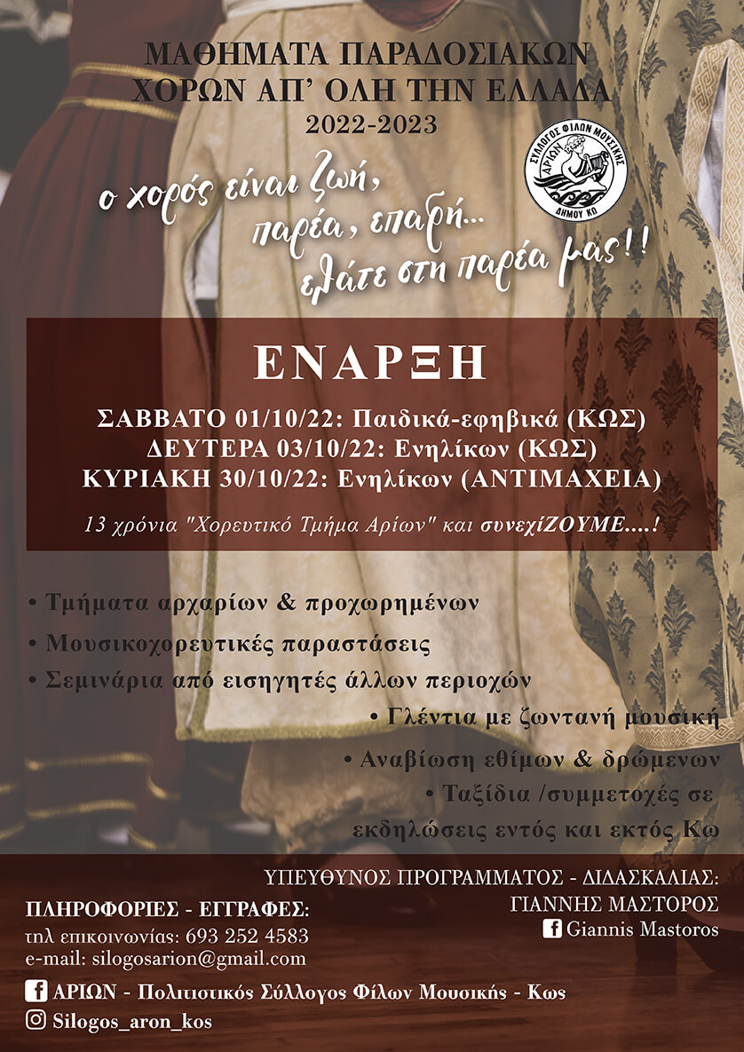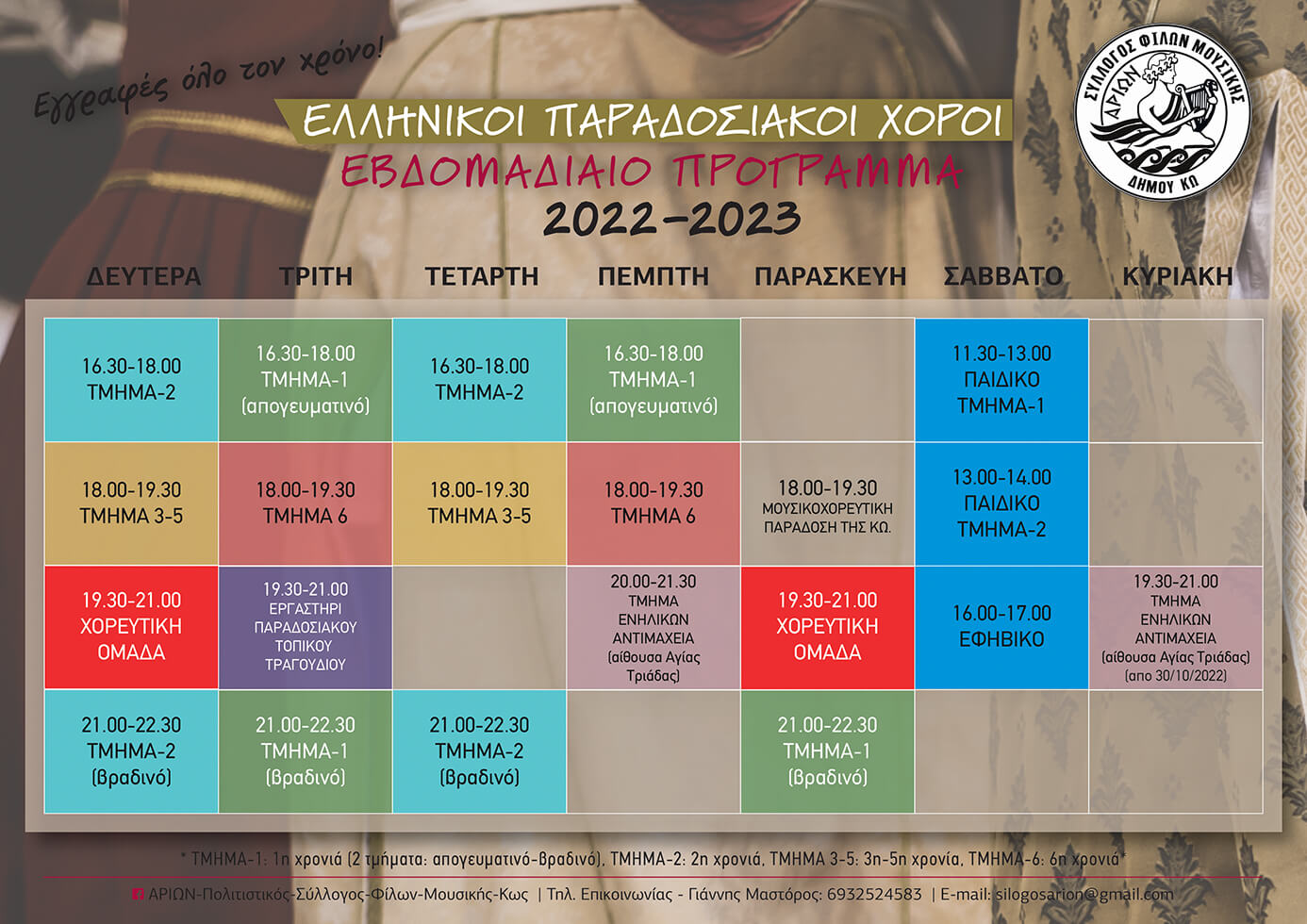 Τα άτομα που συμμετείχαν τα προηγούμενα χρόνια γνωρίζουν τα τμήματα τους(μέρες & ώρες), τα νέα άτομα θα ενταχθούν σε τμήματα κατόπιν συνεννόησης!