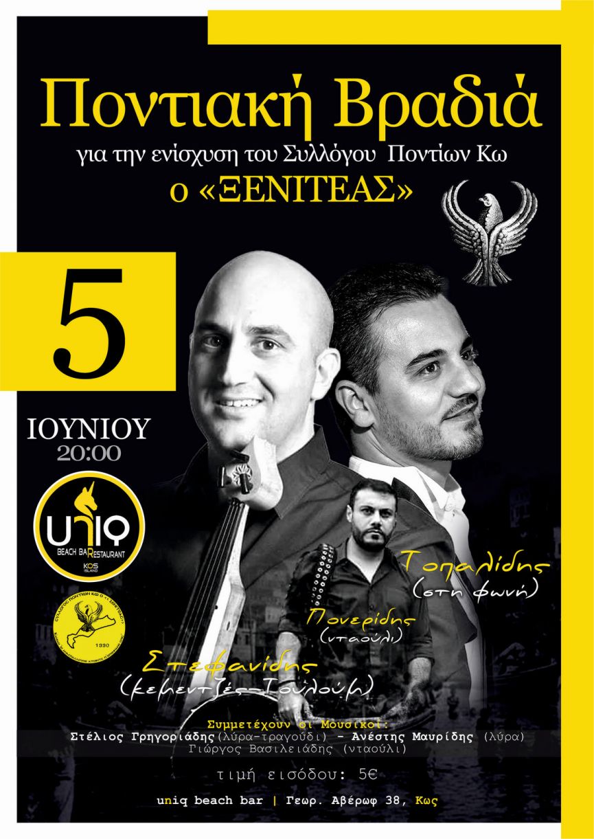 Θα έχουμε μια ξεχωριστή βραδιά με τον Βασίλη Τοπαλίδη στο τραγούδι, τον Παναγιώτη Στεφανίδη στην Ποντιακή λύρα και το τουλούμ και τον Πανταζή Πονερίδη στο νταούλι ενώ θα πλαισιώσουν και οι δικοί μας καλλιτέχνες Στέλιος Γρηγοριάδης (τραγούδι,λύρα), Ανέστης Μαυρίδης (λύρα) και Γιώργος Βασιλειάδης (νταούλι).