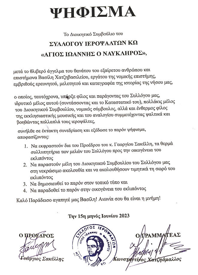 Το Διοικητικό Συμβούλιο του Συλλόγου μας εκπροσωπώντας τα μέλη του, εκφράζει τη βαθιά του θλίψη για την απώλεια του Βασίλη Χατζηβασιλείου, δικηγόρου, διακεκριμένου ιστορικού της Κω, και συγγραφέα.