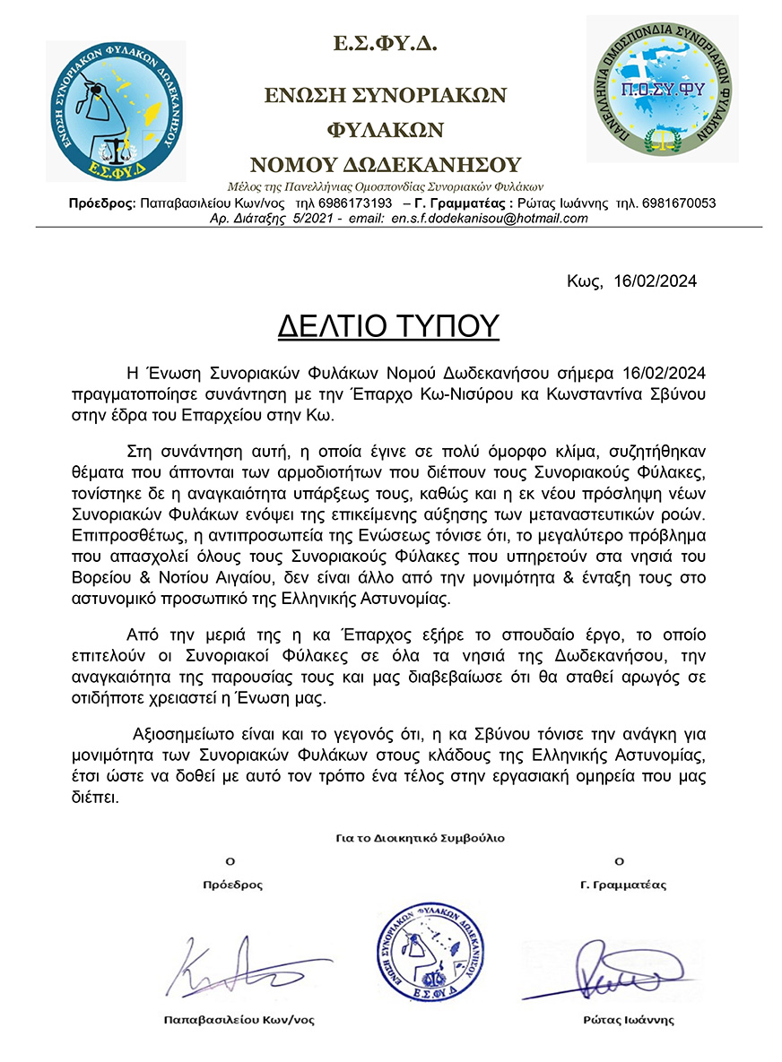 Συνάντηση της Ένωσης Συνοριακών Φυλάκων Δωδεκανήσου με την Έπαρχο Κω - Νισύρου Ν. Σβύνου