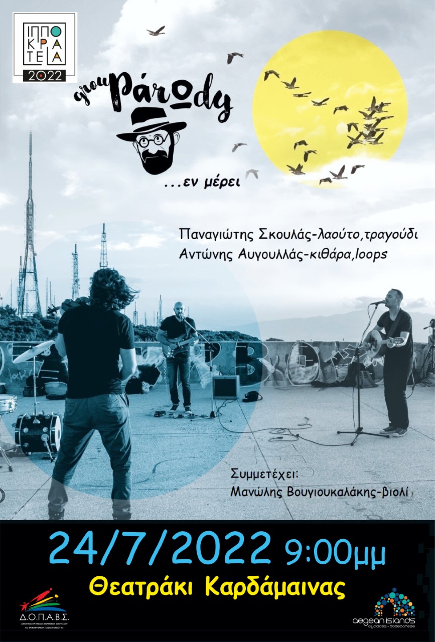 Η Περιφέρεια Νοτίου Αιγαίου με την στήριξη του ΔΟΠΑΒΣ στα πλαίσια των Θερινών Ιπποκρατείων 2022 διοργανώνει συναυλία με το συγκρότημα “GROUP PARΩDY” την Κυριακή 24 Ιουλίου και ώρα 21:00 στο Θεατράκι Καρδάμαινας.