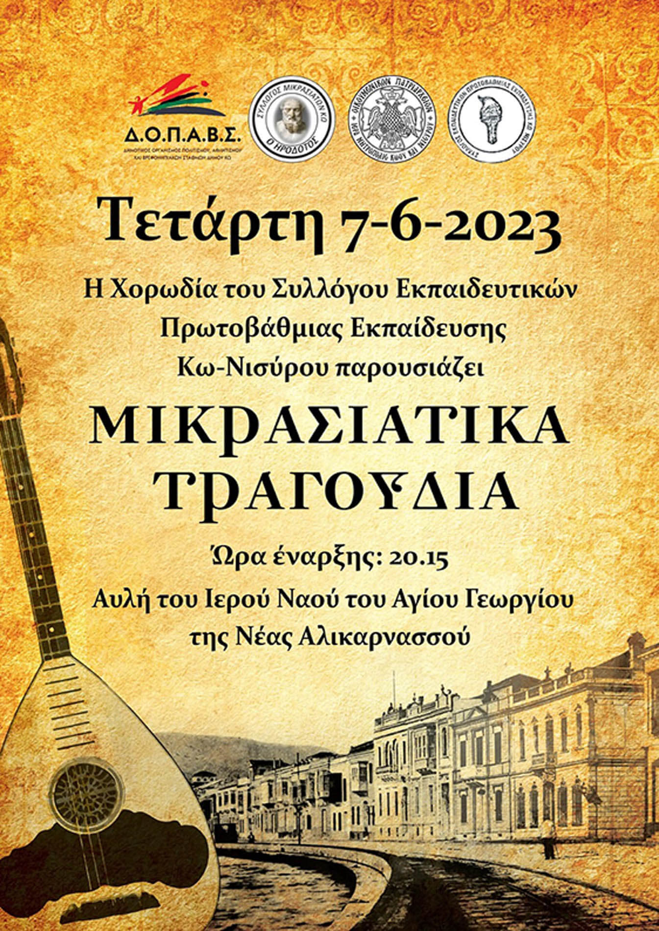 Η Χορωδία του Συλλόγου Εκπαιδευτικών Πρωτοβάθμιας Εκπαίδευσης Κω-Νισύρου, η Ιερά Μήτρόπολη Κω-Νισύρου, ο Σύλλογος Μικρασιατών Κω «Ο Ηρόδοτος» και ο Δ.Ο.Π.Α.Β.Σ. διοργανώνουν συναυλία με Μικρασιάτικα τραγούδια την Τετάρτη 7 Ιουνίου 2023 στις 20:15 στην Aυλή του Ιερού Ναού Αγίου Γεωργίου Νέας Αλικαρνασσού.