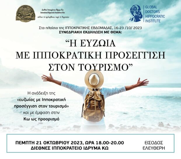 Την ανάδειξη της «ευζωίας με Ιπποκρατική προσέγγιση στον τουρισμό» και με έμφαση στην Κω ως προορισμό, θα αναδείξει η συνεδριακή εκδήλωση που πραγματοποιείται στο πλαίσιο της της «ΙΠΠΟΚΡΑΤΙΚΗΣ ΕΒΔΟΜΑΔΑΣ 16 -22/10/23», που οργανώνει το Διεθνές Ιπποκράτειο Ίδρυμα Κω την Πέμπτη 19 Οκτωβρίου 2023 από τις 18.00 – 29.00.