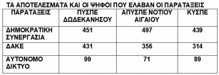 Στις εκλογές των εκπαιδευτικών Πρωτοβάθμιας Εκπαίδευσης Δωδεκανήσου που έγιναν (ηλεκτρονικά) το Σάββατο 5 Νοεμβρίου, για την ανάδειξη των αιρετών εκπροσώπων τους στα υπηρεσιακά συμβούλια του ΠΥΣΠΕ Δ Δωδεκανήσου, του ΑΠΥΣΠΕ Νοτίου Αιγαίου και για το κεντρικό συμβούλιο του ΚΥΣΠΕ, πρώτη δύναμη και στα τρία συμβούλια στα Δωδεκάνησα αναδείχτηκε η παράταξη της ΔΗΜΟΚΡΑΤΙΚΗΣ ΣΥΝΕΡΓΑΣΙΑΣ/ ΑΝΕΞΑΡΤΗΤΕΣ ΚΙΝΗΣΕΙΣ ΕΚΠΑΙΔΕΥΤΙΚΩΝ Π.Ε. ΔΩΔΕΚΑΝΗΣΟΥ (ΔΗ.ΣΥ./Α.Κ.Ε.).