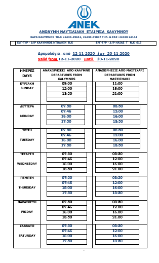 Τα δρομολόγια για Κάλυμνος – Μαστιχάρι των ταχυπλόων της ΑΝΕΚ για την περίοδο από 12 έως 20 Νοεμβρίου, λόγω των ειδικών συνθηκών και κυρίως λόγω του ότι το «Ολύμπιος Ζευς» σταμάτησε, διαμορφώνονται σύμφωνα με τον παρακάτω πίνακα.