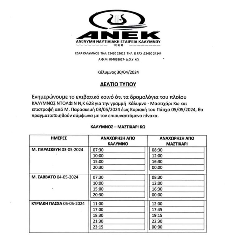 Τα δρομολόγια του “ΚΑΛΥΜΝΟΣ ΝΤΟΛΦΙΝ” από Μεγάλη Παρασκευή μέχρι και Κυριακή του ΠΑΣΧΑ προς Μαστιχάρι και επιστροφή.
