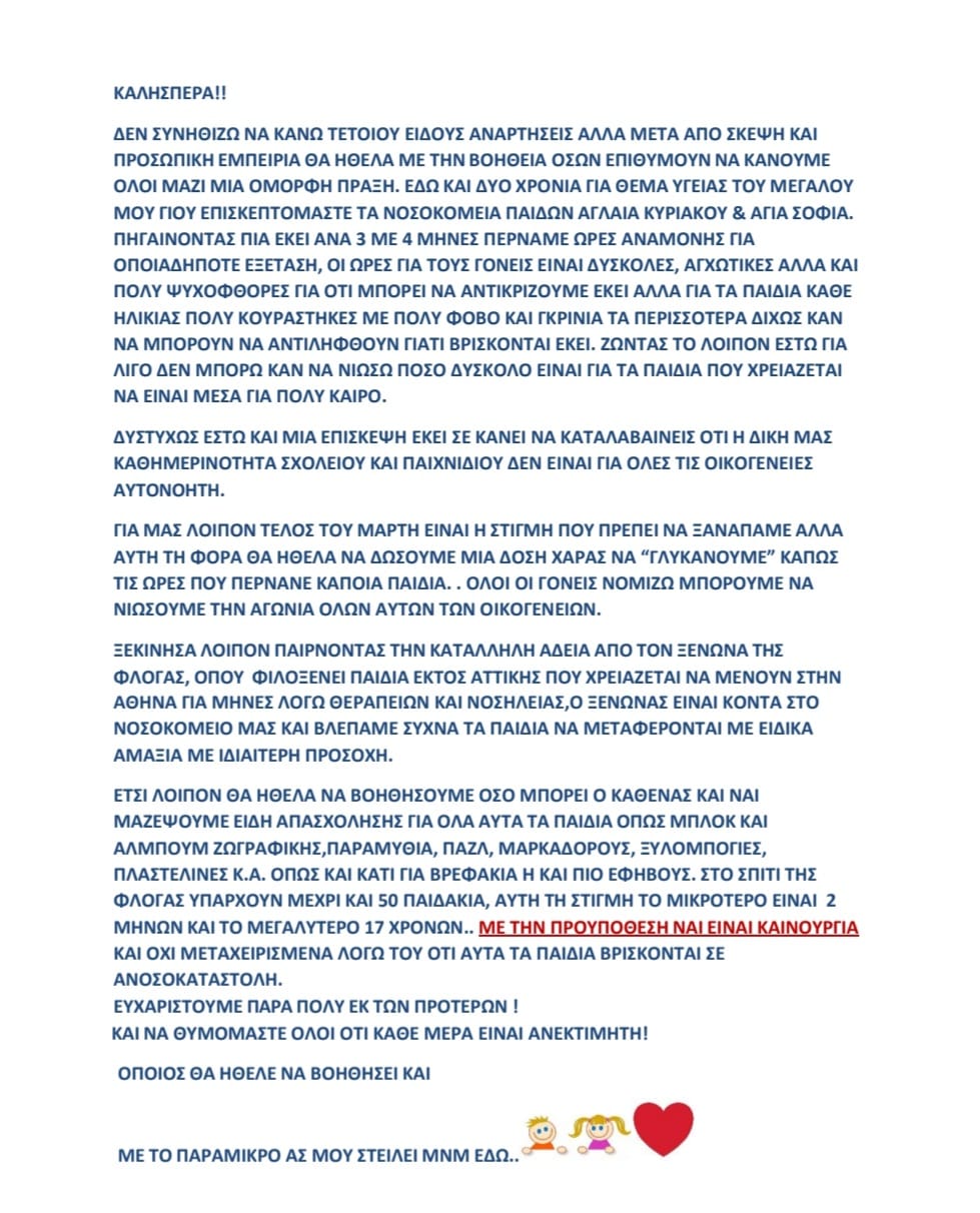 Τεράστια είναι η ανταπόκριση των Κώων στο κάλεσμα που έκανε η συμπολίτισσά μας Νάνσυ Καλσάτου για την στήριξη των παιδιών στα νοσοκομεία «Αγλαΐα Κυριακού» και «Αγία Σοφία».