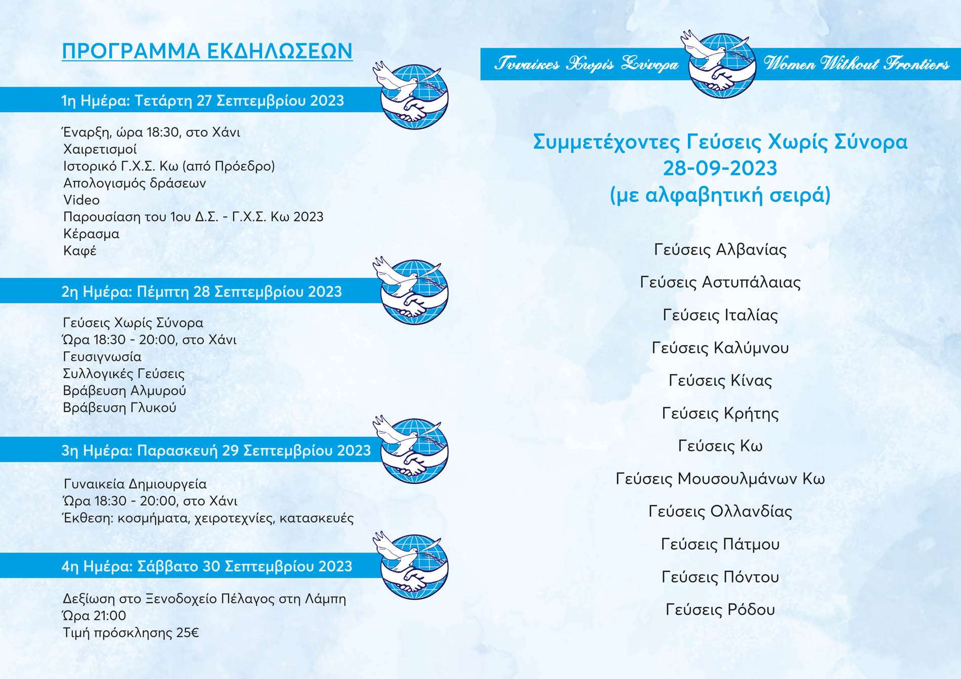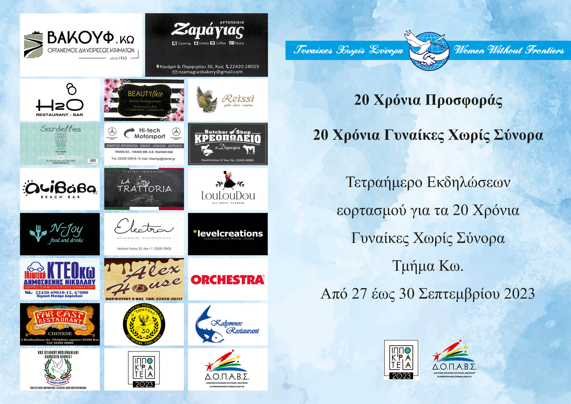 Με τετραήμερο εκδηλώσεων θα εορτάσει τα 20 χρόνια από την ίδρυση του, το τμήμα Κω της οργάνωσης «Γυναίκες χωρίς Σύνορα» .Το πρόγραμμα έχει ως εξής: