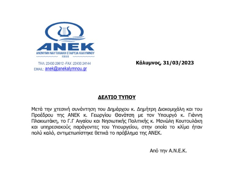 Από την ΑΝΕ Καλύμνου εκδόθηκε το παρακάτω δελτίο τύπου αναφορικά με τη χθεσινή συνάντηση του Δημάρχου Δ.Διακομιχάλη με τον Υπουργό Ναυτιλίας και Νησιωτικής Πολιτικής Ιωάννη Πλακιωτάκη.