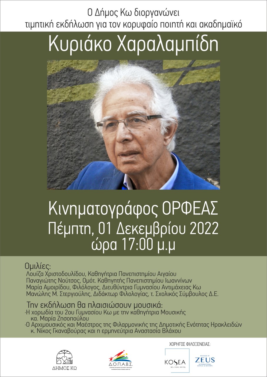 Ο Δήμος Κω διοργανώνει τιμητική εκδήλωση για τον πολυβραβευμένο Κύπριο ποιητή και Ακαδημαϊκό Κυριάκο Χαραλαμπίδη, Επίτιμο Δημότη της Κω, για την πολύτιμη και πολύχρονη προσφορά του στα γράμματα και τον πολιτισμό, την Πέμπτη 1 Δεκεμβρίου ώρα 17:00 στον Κινηματογράφο «Ορφέα».