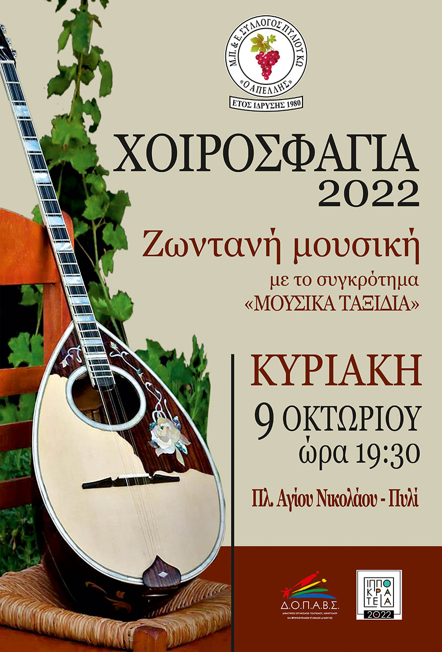 Ο Μορφωτικός Πολιτιστικός Εξωραϊστικός Σύλλογος Πυλίου «Ο Απελλής», ο ΔΟΠΑΒΣ και η Κοινότητα Πυλίου στα πλαίσια των Θερινών Ιπποκρατείων 2022 διοργανώνουν τα Παραδοσιακά Χοιροσφάγια με πλούσια τοπικά εδέσματα και το συγκρότημα «Μουσικά Ταξίδια» την Κυριακή 09 Οκτωβρίου 2022 στις 19:30 στην Πλατεία Αγίου Νικολάου στο Πυλί.
